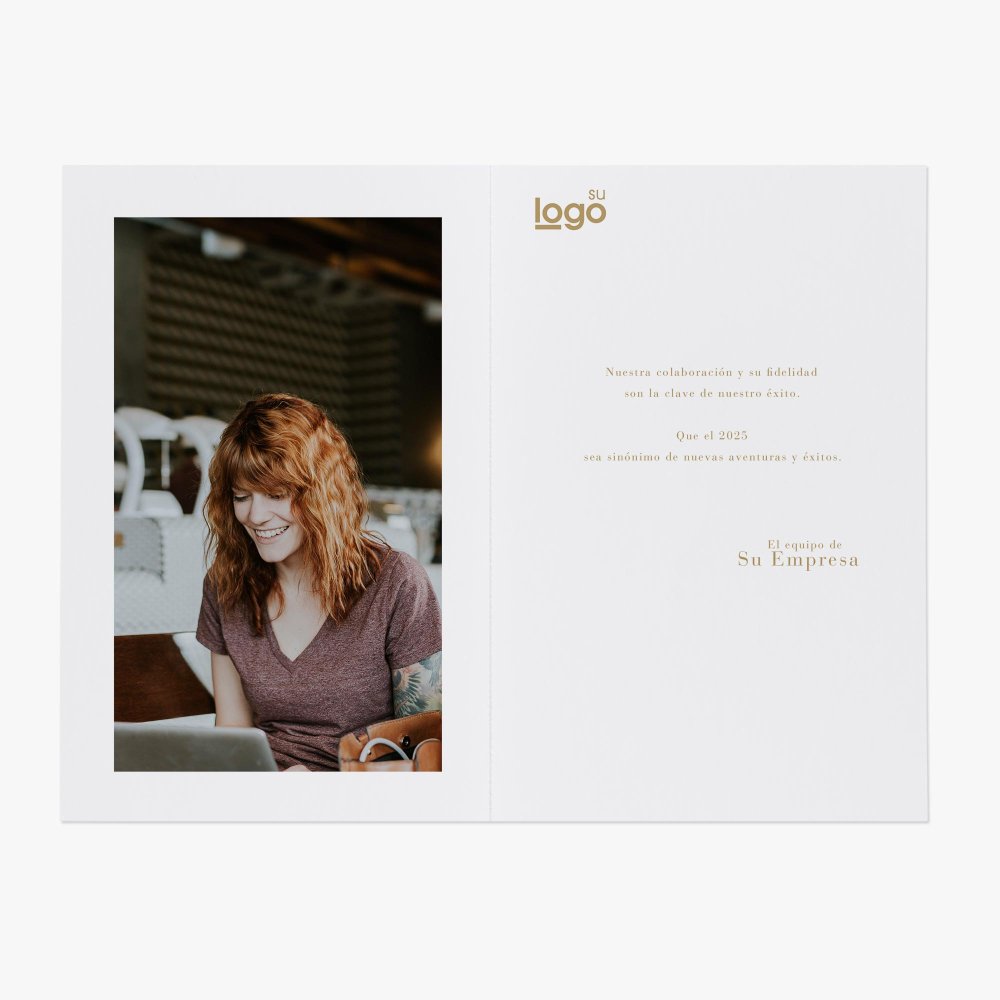 Envíe sus felicitaciones navideñas con una tarjeta impresa en papel certificado ECF, TCF et FSC®, de primera calidad y personalizable con su logotipo, datos de contacto y sitio web.