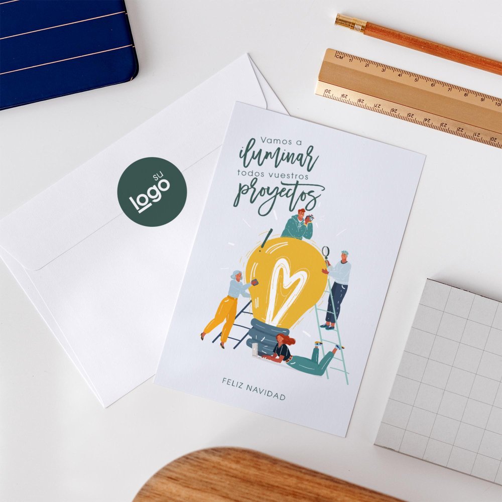 Envíe sus felicitaciones navideñas con una tarjeta impresa en papel certificado ECF, TCF et FSC®, de primera calidad y personalizable con su logotipo, datos de contacto y sitio web.