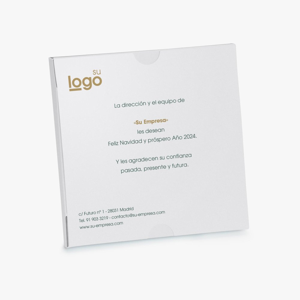 Elija su tableta de chocolate y personalice su caja con el logo de su empresa, sus datos y su web. En el dorso podrá incluir sus mensajes para desear lo mejor en estas fechas navideñas.